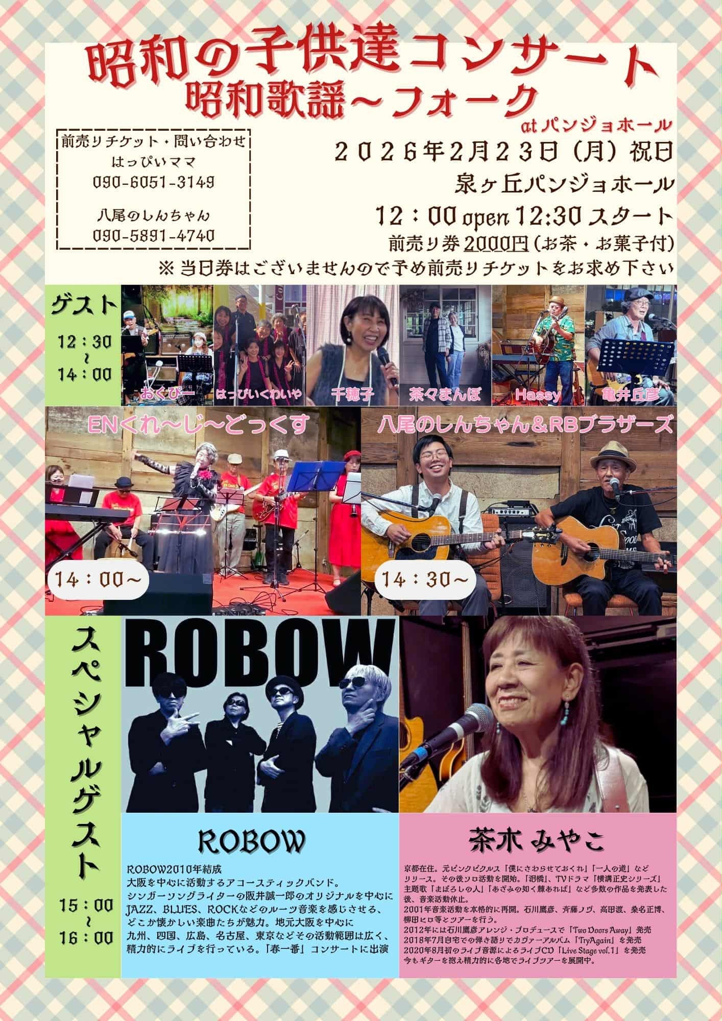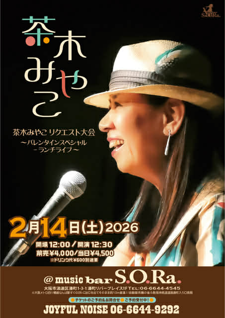 | 2月14日(土) 大阪 なんば「music bar SORa」 茶木みやこリクエスト大会 ~バレンタインスペシャル ランチライブ~ open:12:00 start 12:30 前売り:¥4000 当日:¥4500 共に1D ¥600別途 座席指定 場所:大阪市浪速区湊町1-3-1 1F お問合せ&ご予約/JOYFUL NOISE] TEL.06-6644-9292 受付時間 12:00〜20:00まで 最終受付は公演前日20:00まで チラシはこちら。 終わりにすると言っていましたリクエスト大会 皆さんからのご要望により また私としても面白い企画ライブ 急遽開催決定! 背中を押して下さった皆さん、ありがとう‼️ ピンクピクルス、茶木みやこソロの楽曲 徳間音工に移籍してからのソロ楽曲 2001年音楽活動再してからの楽曲 皆さんからのリクエストが楽しみです ドキドキハラハラ 宜しくお願いします 2月23日(月・祝) 泉ヶ丘「パンジョホール」 昭和の子供達コンサート 昭和歌謡〜フォーク open:12:00 start:12:30 前売り券:¥2000(お茶・お菓子付) *当日券はございませんので予め 前売りチケットをお求め下さい 12:30〜14:00 おくぴー・はっぴいくわいや・千穂子 Hassy・茶々まんぽ・Hassy・亀井丘彦 14:00~ ENくれ~じ~どっくす 14:30~八尾の真ちゃん&RBブラザーズ 15:00~16:00 スペシャルゲスト ROBOW・茶木みやこ 場所:泉北ニュータウン駅前 前売りチケット問合せ はっぴいママ 090-6051-3149 八尾のしんちゃん 090-5891-4740 チラシはこちら。 |