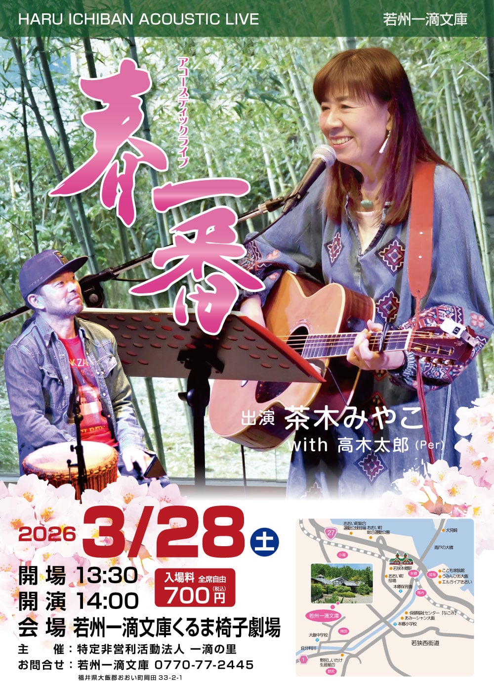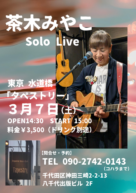 | 3月 7日(土) 水道橋「タペストリー」 茶木みやこSolo Live open:14:30 start:15:00 料金:¥3500(ドリンク別途) 場所:千代田区神田三崎2-2-13 八千代出版ビル 2F お問い合わせ&ご予約:TEL.090-2742-0143(コハラ) チラシはこちら。 3月 8日(日) 鶴ヶ峰「陽のあたる道」 茶木みやこSolo Live open:14:30 start:15:00 チャージ:¥3500(w/drink) 場所:横浜市旭区鶴ヶ峰2-62-20 お問い合わせ&ご予約:TEL.045-744-7017 HPはこちら。 チラシはこちら。 3月 9日(月) 東中野「Cafe' じみへん」 open:19:00 start:19:30 料金:¥3500+drink 場所:中野区東中野1-46-11 HIKOTAビル1F お問い合わせ&ご予約:TEL.090-9242-6183 HPはこちら。 チラシはこちら。 3月28日(土) 若州一滴文庫くるま椅子劇場 ~春一番アコースティックライブ~ 茶木みやこ with 高木太郎(Per) open:13:30 start:14:00 入場料:¥700(税込) 全席自由 場所:福井県大飯郡おおい町岡田33-2-1 主催:特定非営利活動法人 一滴の里 お問合せ::若州一滴文庫 TEL.07770-77-2445 チラシはこちら。 *「冬ごもりライブ」から「春一番アコースティックライブ」と回を重ねて来ました 若州一滴文庫くるま椅子劇場で2026年も歌います。 素晴らしいステージとナチュラルな音の響き、 是非みなさんに若州一滴文庫と併せて是非見て聞いて頂きたいです! お待ちしています! 3月29日(日) 長浜「川崎や」 茶木みやこ with 高木太郎(Per) open:18:30 start:19:00 料金:¥3000 場所:長浜市大宮町8-8 お問い合わせ&ご予約:清水メガネ店 TEL.0749-62-4543 HPはこちら。 チラシはこちら。 |