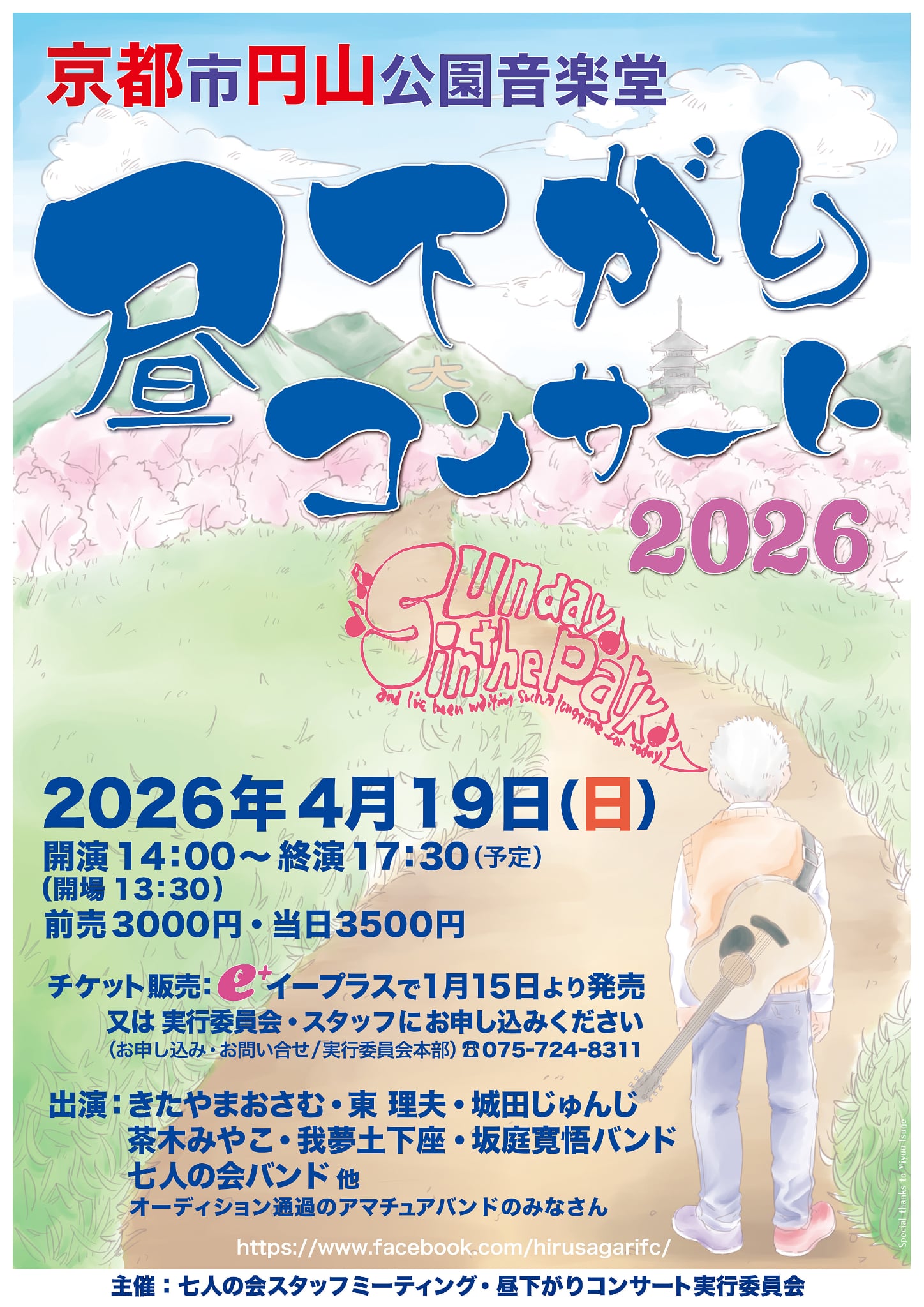| 4月11日(土) 松江「ハートランド」 open:16:30 start:17:00 料金:¥3500(1ドリンク付) お問い合わせ&ご予約:0852-.31-2422(ハートランド) チラシはこちら。 4月12日(日) 島根 大田市 *詳細後日 4月19日(日) 京都市円山公園音楽堂 「昼下がりコンサート 2026」 open:13:30 start:14:00 ~終演 17:30(予定) 前売り:3000円 当日:3500円 出演 きたやまおさむ・東 理夫・城田じゅんじ 茶木みやこ・我夢土下座・坂庭寛悟バンド・七人の会バンド他 オーディション通過のアマチュアバンドの皆さん チケット販売:e+イープラスで1月15日より販売 又は実行委員会・スタッフにお申し込み下さい お申し込み・お問合せ/実行委員会本部 TEL.075-724-8311 チラシはこちら。 主催:七人の会スタッフミーティング・昼下がりコンサート実行委員会 |